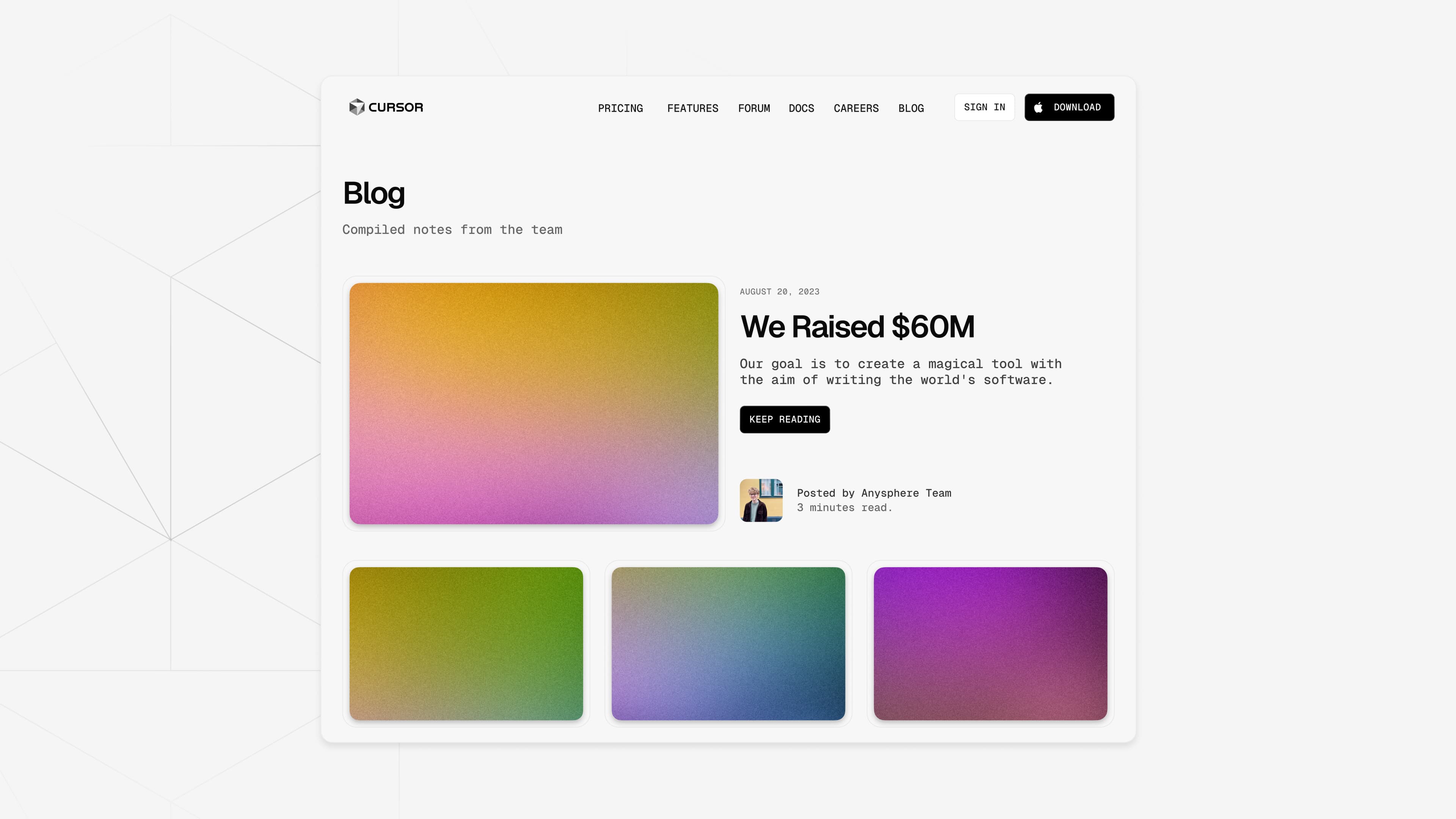 As they scale, their digital presence needs to keep pace. We partnered with Cursor to craft a website that not only reflects their position at the forefront of AI-driven development but is also designed to support the next wave of innovation in software engineering.